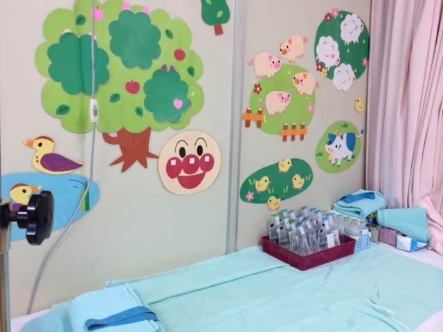 (坂総合病院 小児科の点滴台。こんなに可愛くしても怖いものは怖いのだ。)